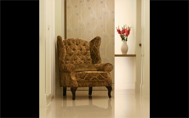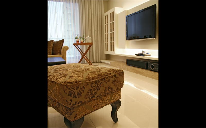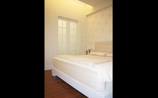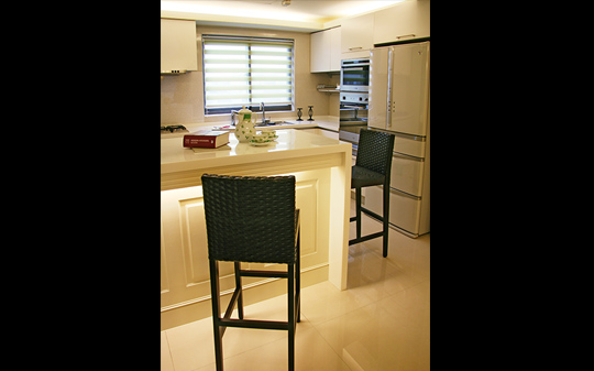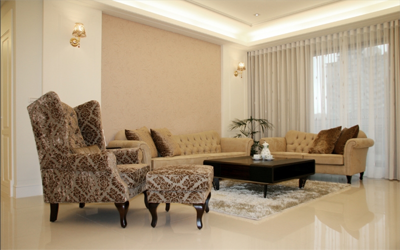 線板設計簡化傳統古典繁複的線條,使天花板及壁面裝飾更顯大方;客廳運用白色及稻禾色系為基調,加上沙發背牆對稱的設計,於演繹古典元素中,更展現空間寬敞的氣勢。