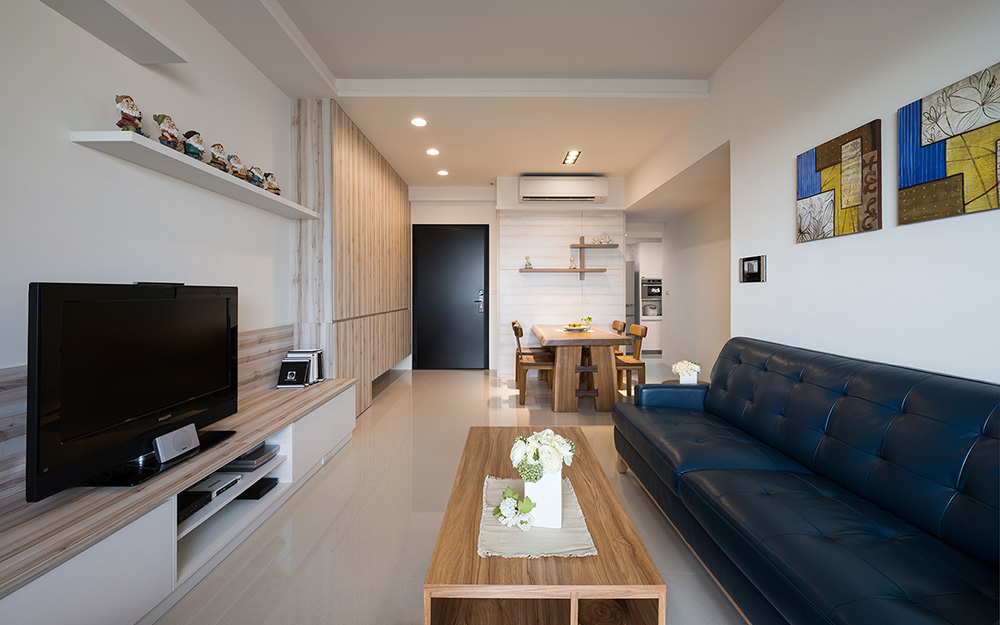空間的整體視覺規劃採用單純的大地色系,客廳大量留白的牆面以不同的木紋材質妝點,