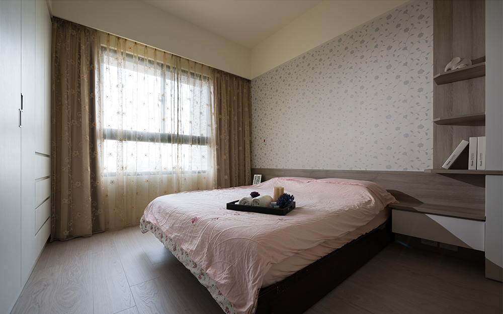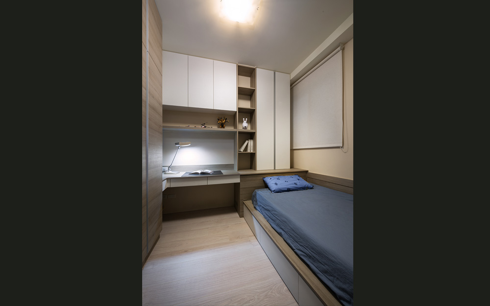 主臥房及男孩房同樣以留白的牆面來襯托出木素材的寧靜與溫潤,佈滿木質語彙的家居空間,醞釀豐富的人文氛圍。