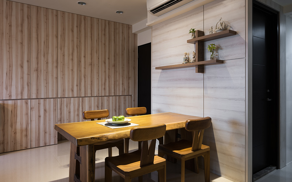 餐廳主牆面以另一木色系及造型層架來營造另一面情境,讓開放的空間在無形之間分為兩個區域,