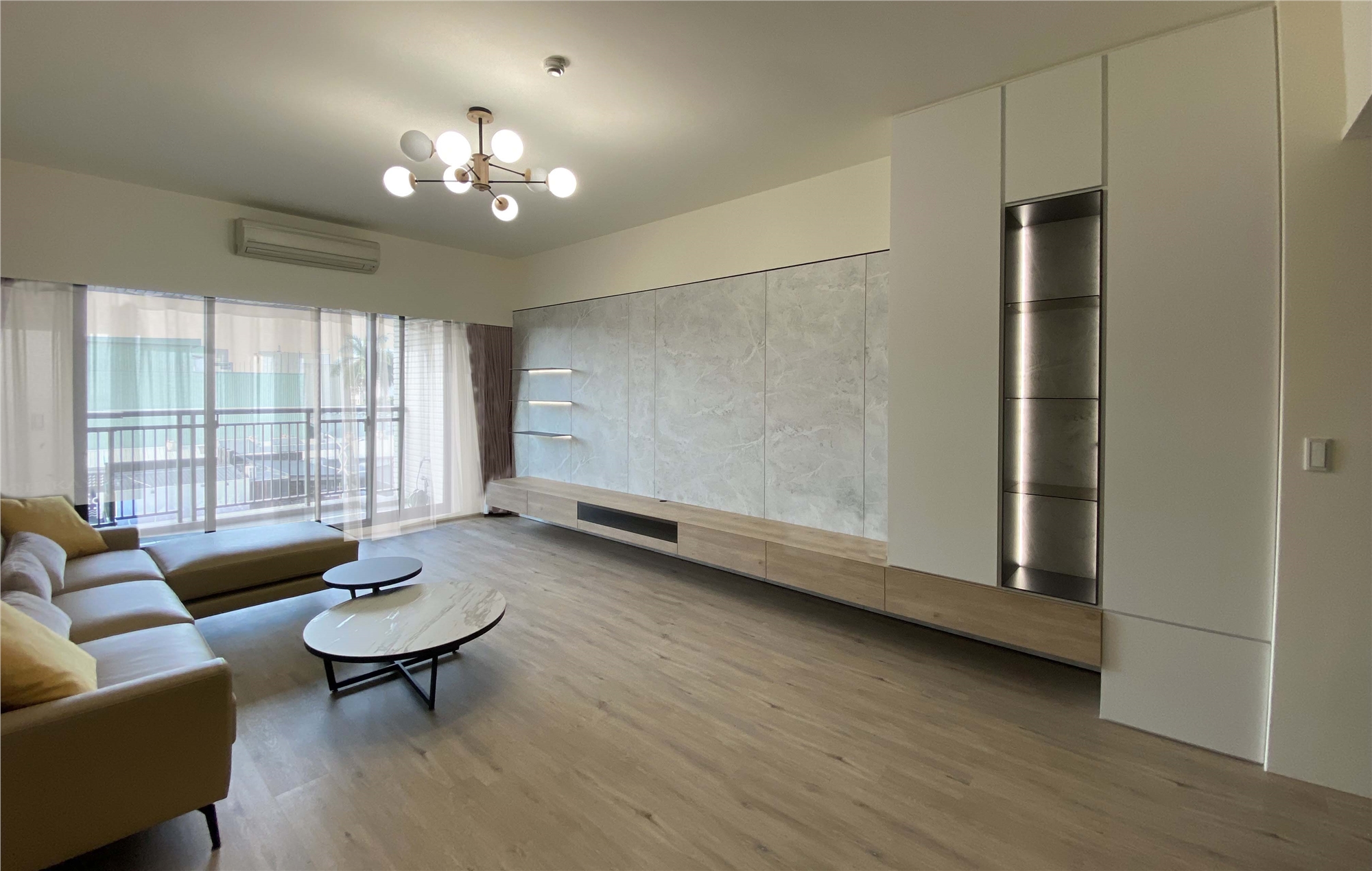 整體引用淺木色為基底,並插穿量體與線條,於客廳電視牆加入石頭紋和燈條,妝點跳色家具與家飾,製造舒適的生活場景。