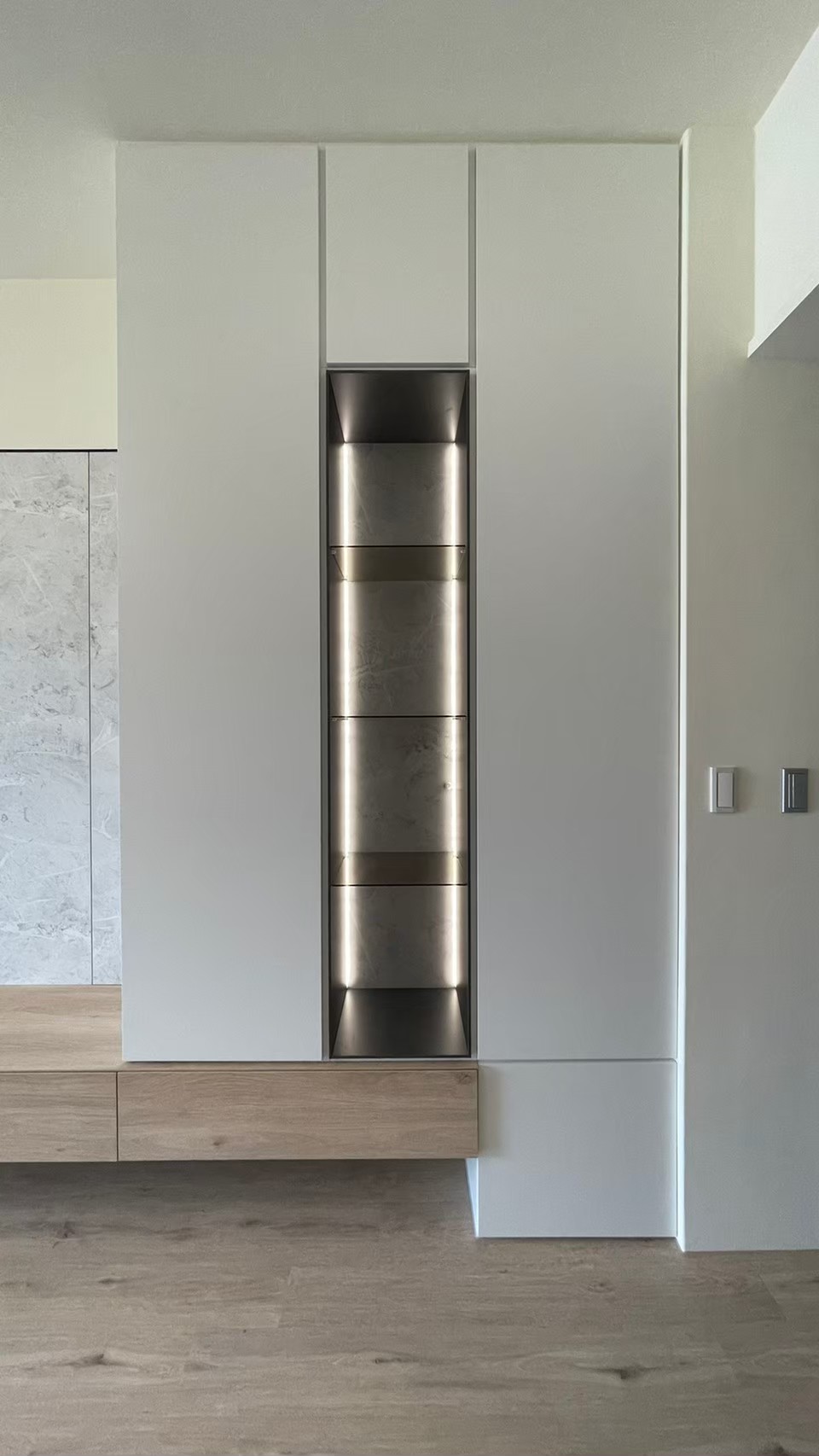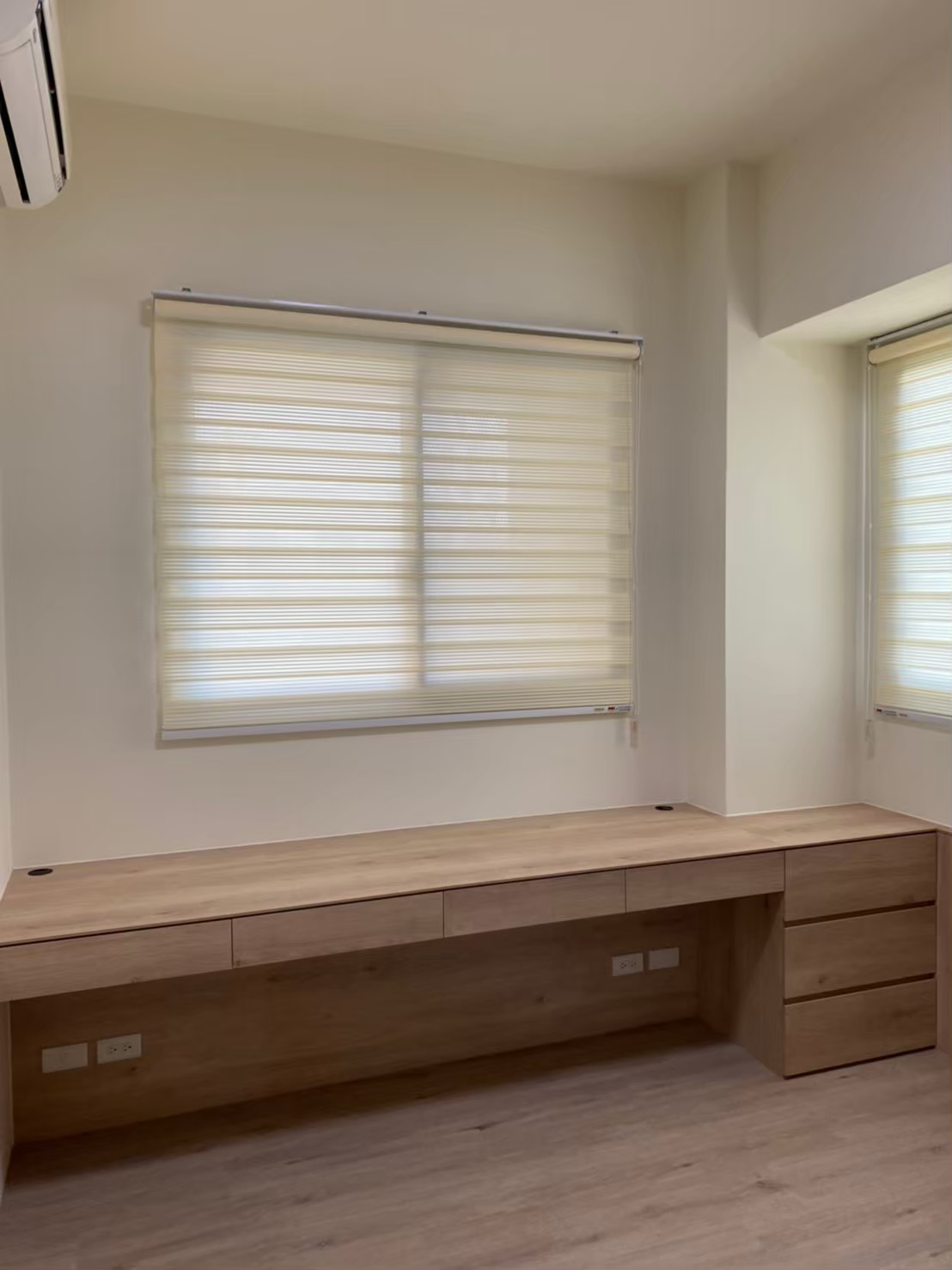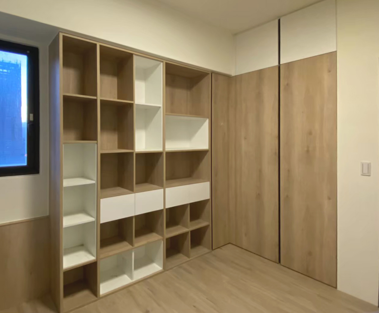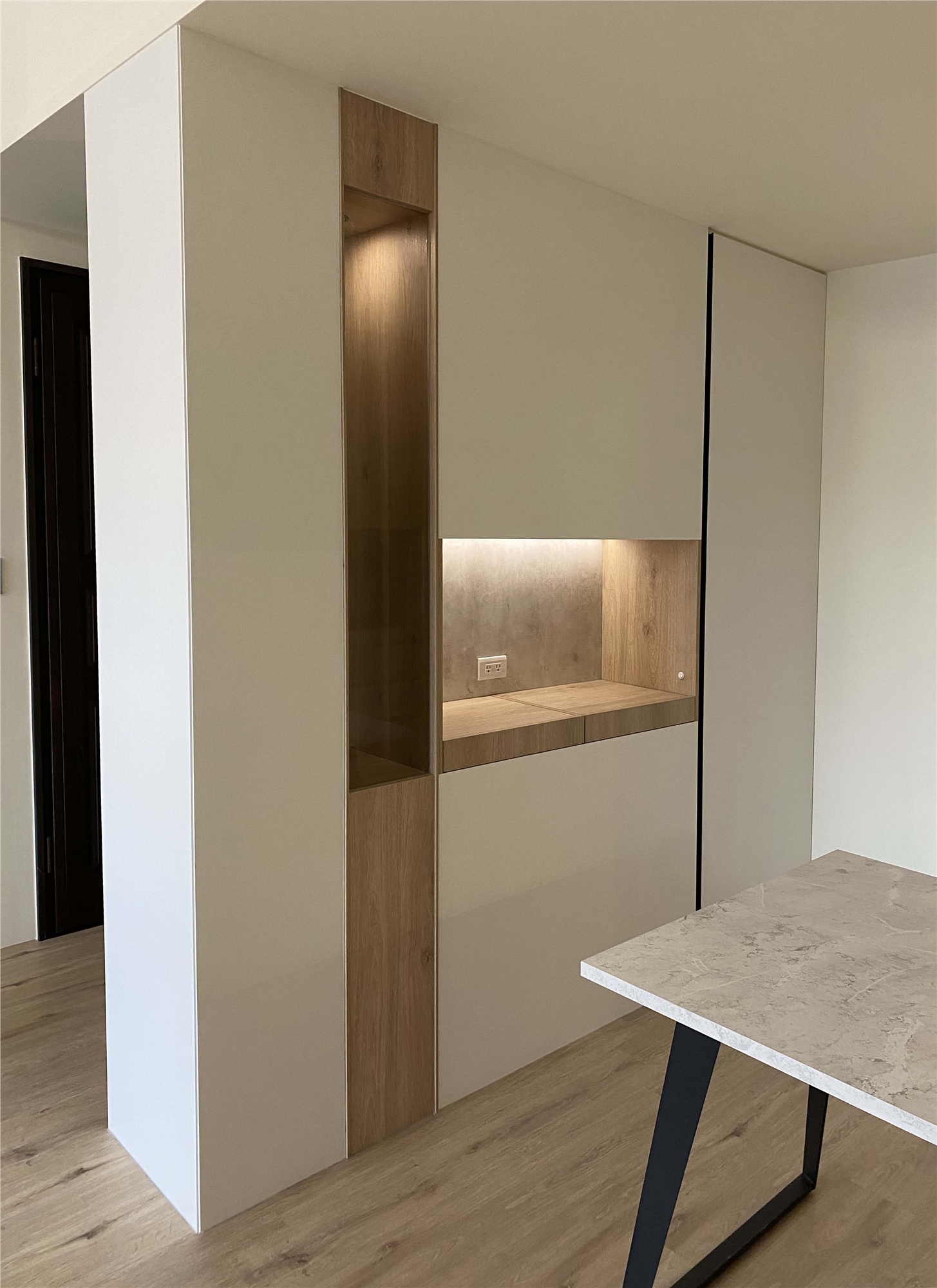 玄關櫃與餐櫃的結合、大量收納機能的書房,滿足男女主人的置物需求,延續白色及淺木色,讓空間能在簡潔中,藉由線條、跳色混搭清新視野。