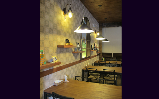 我們將設計重點放在整體造型的協調上,運用立體腰牆搭配弧線造型的拱門及窗框,層次交疊地鑲崁在咖哩黃的牆面。