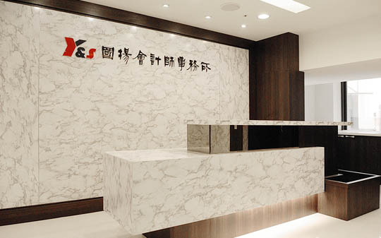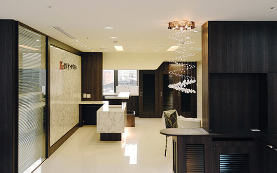 為營造辦公室端莊、專業且穩重的氛圍,我們以深色鐵刀木皮來做整體主視覺,局部以雪白石材紋的系統板去做調和,更顯高貴、大器。
