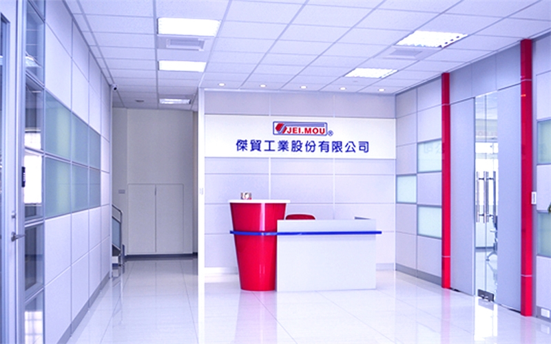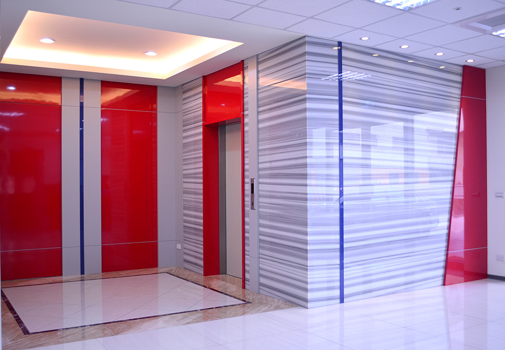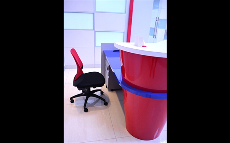 接待區以大方簡約的幾何造型搭配紅藍兩個顏色,並直接運用公司商標為LOGO牆,明亮的採光,簡潔的意象,讓來訪的客人一目瞭然。